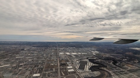 Unfortunately, there was cloud cover most of the way to over Vancouver on this flight, so I was glad to have the wifi to cure me of bordom, and to distract me from the disappointment of not being able to see the snowy peaks of the rocky mountains. Here are some views out my window from the brief moments of clear sky I was able to capture: