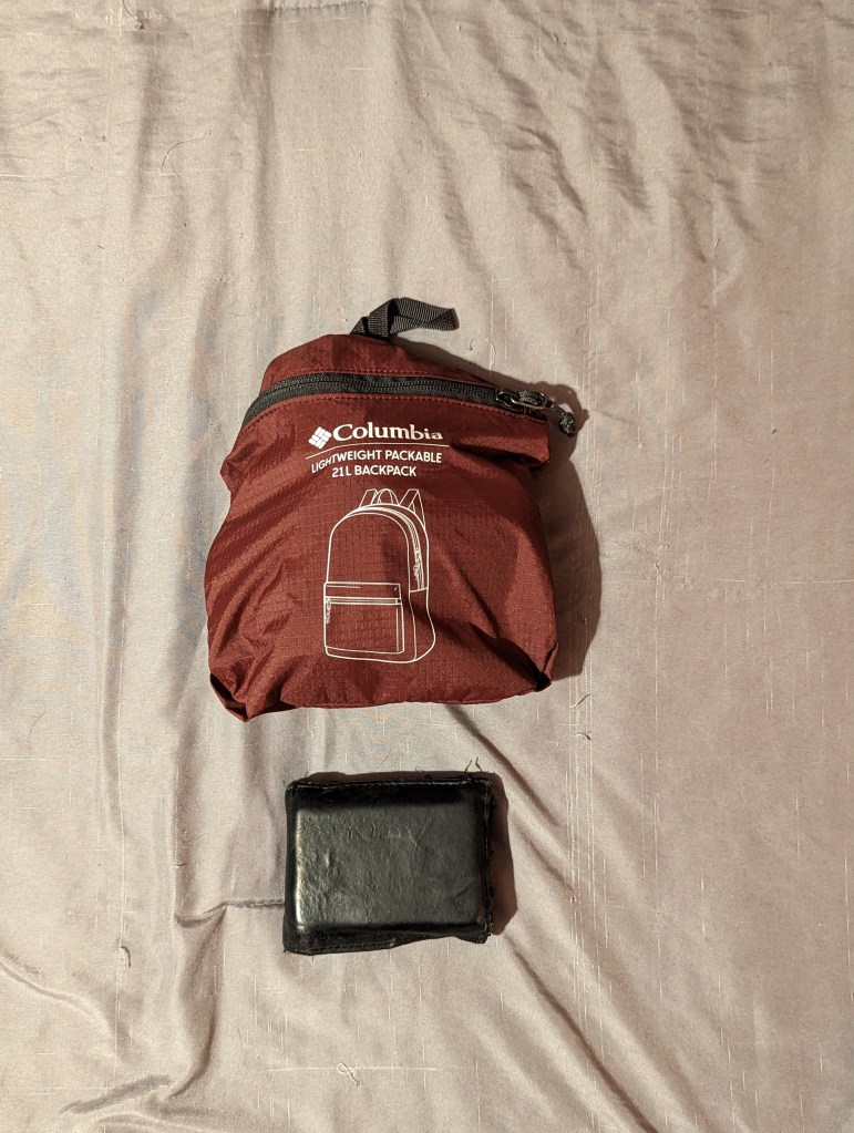 Here are some pictures of the Columbia Packable Backpack, and some items for scale: